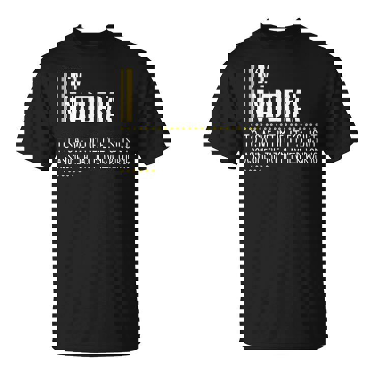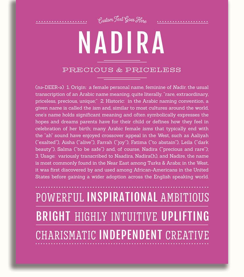 Der Name hat mehrere Bedeutungen. Die Farbenprächtigsten gelten als „besonders“, „unvergleichlich“ und „selten“. Die Popularität des Namens erreichte in den 70-80er Jahren des letzten Jahrhunderts ihren Höhepunkt, aber heute ist er wieder im Kommen. Die Trägerin des Namens hat keine Schutzheiligen, daher feiert Nadira ihren Namenstag nicht.